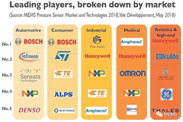 2016~2023年按市場細分的壓力傳感器市場預測汽車類、消費類、醫(yī)療類、工業(yè)類、航空電子和高端市場的競爭格局各異在市場規(guī)模最大的汽車類和消費類市場,Bosch(博世)顯然是占主導地位的領導者。Bosch成功地利用了其在汽車領域的經驗和領先地位,逐漸成為新興消費類市場的領導者。Bosch集合了兩個市場的產能以降低成本,并進一步增強了其競爭優(yōu)勢。Infineon(英飛凌)、Sensata(森薩塔)、Denso(電裝)和Melexis(邁來芯)等其它廠商則專注于汽車類市場,而ST Microelectronic(意法半導體)和Alps(阿爾卑斯)則主要服務于消費類市場。只有TE Connectivity(泰科)和NXP(恩智浦)在多個市場都有涉足。MEMS壓力傳感器主要廠商大多為活躍于多種MEMS傳感器市場的大型集團,其中包括慣性、壓力和氣體傳感器器件。垂直集成多見于汽車行業(yè)的Bosch、Denso和Sensata等廠商,但消費類市場并不常見,因為消費類系統(tǒng)較小,因此不需要一級組件供應商。中小規(guī)模的醫(yī)療類、工業(yè)類、航天電子和高端市場包括了許多相同的主要廠商,包括Honeywell(霍尼韋爾)、Amphenol(安費諾)、NXP、TE Connectivity、Omron(歐姆龍)、First Sensor、Merit、Elmos SMI和TDK。這些廠商通過面向多個市場,提供附加值的模組,來促進業(yè)務增長。當然,也有一些專門聚焦航天電子和高端市場的廠商,例如Kulite 或Memscap。Amphenol和GE(通用電氣),Sensata、Schrader(施耐德)和CST,TDK和Invensense以及Qualcomm(高通)、NXP和Freescale(飛思卡爾)之間的合并和并購(M&A)都涉及了壓力傳感器業(yè)務,因此相關業(yè)務變得更加集中。該領域未來的并購預算可能會超過1億美元。本報告列出了未來可能的并購標的,并將其排名以幫助并購決策。