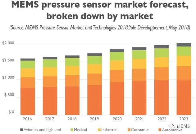 MEMS壓力傳感器應用得益于近些年壓力傳感器在高端智能手機和平板電腦中的快速普及,消費類市場現(xiàn)已成為第二大壓力傳感器市場。并且,受室內導航和室外導航等新用戶案例的驅動,壓力傳感器將進一步向安卓(Android)中低端智能手機普及。壓力傳感器成本的降低,以及更高的精度和改善的功耗,也使新應用的發(fā)展成為可能,例如可穿戴設備、電子香煙、無人機和智能家居等。航空電子和高端應用仍然是壓力傳感器的利基市場,但得益于活躍的飛機市場和MEMS壓力傳感器對傳統(tǒng)技術的取代,因此展現(xiàn)了最快的市場增長率。由于醫(yī)療和工業(yè)市場在應用端沒有顯著的改變,因此這兩塊市場正以平穩(wěn)的速度增長。不過就應用而言有一例外,新型智能醫(yī)療吸入器介于醫(yī)療和消費類市場之間,為未來多種醫(yī)療消費類物聯(lián)網(wǎng)應用打開了大門?傮w而言,MEMS壓力傳感器市場的年增長率預計為3.8%,到2023年總體市場規(guī)模將增長至20億美元。本報告了為每種壓力傳感器市場和應用,分別提出了主要的驅動因素和限制因素,并提供了精確的市場規(guī)模預測和出貨量預測。