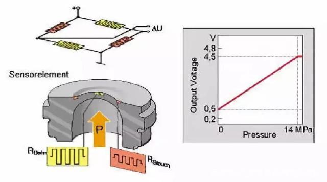 的惠斯頓電橋,膜片的變形導(dǎo)致應(yīng)變計(jì)電阻變化,通過外圍電路的的信號(hào)處理后,形成與壓力成線性關(guān)系的電壓信號(hào)。