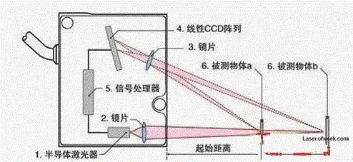 激光發(fā)射器通過鏡頭將可見紅色激光射向物體表面,經(jīng)物體反射的激光通過接受器鏡頭,被內(nèi)部的CCD線性相機接受,根據(jù)不同的距離,CCD線性相機可以在不同的角度下“看見”這個光點。根據(jù)這個角度即知的激光和相機之間的距離,數(shù)字信號處理器就能計算出傳感器和被測物之間的距離。