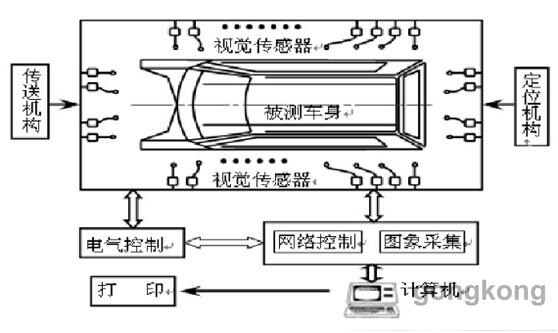 通常,車身的關(guān)鍵尺寸主要是擋風(fēng)玻璃尺寸、車門安裝處棱邊位置、定位孔位置等。因此視覺(jué)傳感器分布于這些位置附近,測(cè)量其相應(yīng)的棱邊、孔、表面的空間位置尺寸。在生產(chǎn)線上設(shè)計(jì)測(cè)量工位,車身定位后,置于一框架內(nèi),框架由縱橫分布的金屬柱、桿構(gòu)成,可根據(jù)需要在框架上靈活安裝視覺(jué)傳感器。根據(jù)測(cè)量點(diǎn)的數(shù)量可安裝相應(yīng)數(shù)量的視覺(jué)傳感器,(通常情況下每個(gè)視覺(jué)傳感器測(cè)量一個(gè)被測(cè)點(diǎn)),根據(jù)不同形式的傳感器包括雙目立體視覺(jué)傳感器、輪廓傳感器等多種類型。