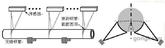 測(cè)量系統(tǒng)由多個(gè)結(jié)構(gòu)光傳感器組成,傳感器上結(jié)構(gòu)光投射器投射的光平面和被測(cè)鋼管相交,得到鋼管截面圓周上的部分圓弧,傳感器測(cè)量部分圓弧在空間中的位置。系統(tǒng)中每一個(gè)傳感器實(shí)現(xiàn)一個(gè)截面上部分圓弧的測(cè)量,通過(guò)適當(dāng)?shù)臄?shù)學(xué)方法,由圓弧擬合得到截面尺寸和截面圓心的空間位置,由截面圓心分布的空間包絡(luò),得到直線度參數(shù)。測(cè)量系統(tǒng)在計(jì)算機(jī)的控制下,可在數(shù)秒內(nèi)完成測(cè)量,滿足實(shí)時(shí)性要求。