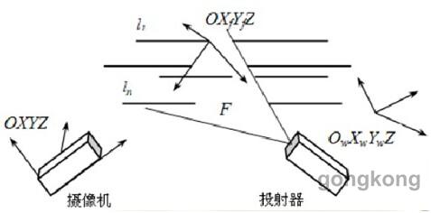 這項(xiàng)傳感器的視覺(jué)掃描測(cè)頭采用局域雙目立體視覺(jué)測(cè)量原理設(shè)計(jì)。形貌整體拼接實(shí)質(zhì)上是將所采集到的數(shù)據(jù)放到公共坐標(biāo)上,這樣就能得到整體的數(shù)據(jù)描述。通過(guò)高分辨率數(shù)碼相機(jī)從測(cè)量空間的上方以不同的角度和位置對(duì)被測(cè)量進(jìn)行數(shù)據(jù)收集,運(yùn)用光束定向交匯平差原理得到控制點(diǎn)空間坐標(biāo)并建立全局坐標(biāo)系,最后通過(guò)各個(gè)坐標(biāo)系進(jìn)行關(guān)聯(lián)、轉(zhuǎn)換,完成數(shù)據(jù)拼接。
