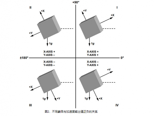 而當我們使用雙軸加速度傳感器檢測360°范圍傾斜角時,設(shè)加速度傳感器兩個輸出軸Ax與Ay。并且兩個輸出軸互相垂直,這樣我們便可通過Ax與Ay的正負值來判斷旋轉(zhuǎn)角度的范圍,從而使得雙軸加速度傳感器輸出值與傾斜角度在360°范圍內(nèi)一一對應(yīng)。