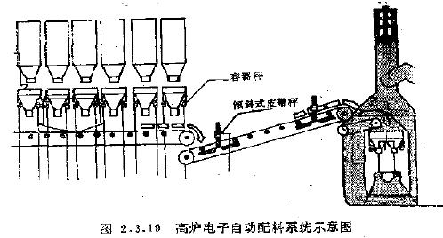 圖2.3.19為煉鐵廠六種原料自動配料系統(tǒng)的布局示意圖。工藝中需要的六種原料,分別裝在六個不同的大料倉中。大料倉下對應設(shè)有六個稱量料斗,根據(jù)煉鐵工藝的配方比例,六個稱量料斗大小不一,載荷不一。