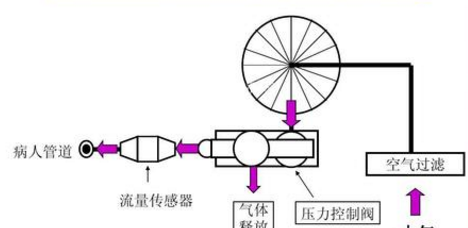 流量傳感器將測(cè)量到的實(shí)際值饋送到電子控制部分與面板設(shè)置值比較,利用兩者間的誤差控制伺服閥門來(lái)調(diào)節(jié)吸入和呼出氣體流量;
