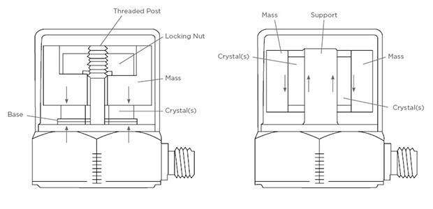 壓縮模式設(shè)計(jì)通過(guò)在壓電晶體頂部加載一個(gè)質(zhì)量塊并施加預(yù)載力以使壓電晶體受壓來(lái)實(shí)現(xiàn)。由于性能限制,此類設(shè)計(jì)已經(jīng)過(guò)時(shí),不再那么流行。這類結(jié)構(gòu)容易受到安裝基座應(yīng)變的影響,且具有較高的熱漂移。