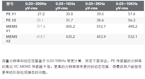測(cè)試結(jié)果說(shuō)明如下。假設(shè)最大 ±1dB 的幅度偏差作為可用帶寬,但帶寬容差通常使用 ±5% 的更嚴(yán)格的偏差。數(shù)據(jù)表明,VC MEMS 傳感器的可用帶寬高達(dá) 3KHz,而壓電傳感器的可用帶寬 >10KHz(該特定 PE 傳感器的可用帶寬在最高 14KHz 的規(guī)格范圍內(nèi))。