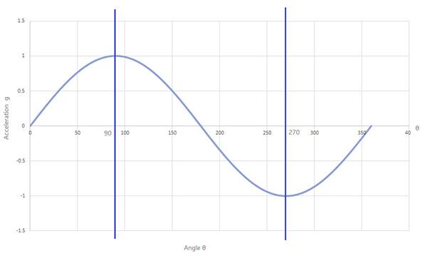 根據(jù)tan(θ)函數(shù)特性可以看出,隨著θ增大,增量靈敏度越來越高。同時可以看出,如果要計算系統(tǒng)最小靈敏度,可以取θ=0時輸出變化的增量。根據(jù)公式Ax=sin(θ)*1g,可以近似計算最小靈敏度。當(dāng)θ=0時,S[g]= ΔAx= sin(P)*1g , 其中P為系統(tǒng)要求的最小步長。