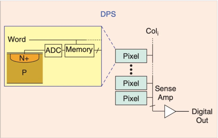上圖顯示了APS(有源像素傳感器)架構(gòu)。在APS設(shè)備中,每個像素位置不僅包含光電二極管,而且包含放大器。一種稱為PPS(無源像素傳感器)的更簡單的體系結(jié)構(gòu)沒有將放大器集成到像素中。在DPS(數(shù)字像素傳感器)設(shè)備中,每個像素都有自己的模數(shù)轉(zhuǎn)換器和存儲塊。因此,DPS體系結(jié)構(gòu)中的像素輸出與光強度成比例的數(shù)字值。