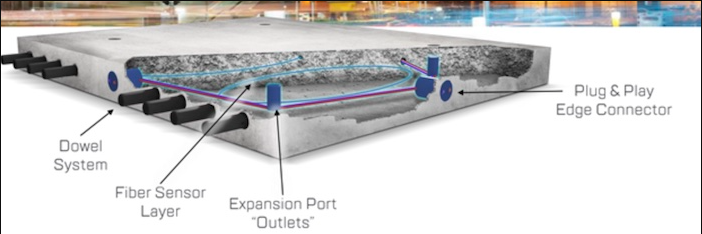 嵌入預(yù)制混凝土路面的光纖傳感器層利用蝕刻的光纖和入射光的失真來解釋有關(guān)其上方道路上發(fā)生的情況的數(shù)據(jù)。