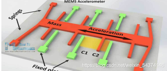首先了解一下MEMS加速度計(jì)的原理,簡(jiǎn)圖如下圖所示,其中質(zhì)量塊mass被彈簧springs支撐,使得其只能沿著預(yù)定方向位移,從而檢測(cè)特定方向的加速度;綠的部分是固定的電極板Fixed plates。檢測(cè)原理是當(dāng)質(zhì)量塊感受到加速度時(shí),會(huì)在相應(yīng)方向產(chǎn)生位移,從而使得固定電極板構(gòu)成的兩個(gè)平行板電容器C1,C2的電容大小發(fā)生改變,檢測(cè)其電容值大小即可換算成相應(yīng)的加速度