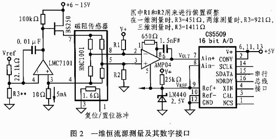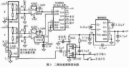 圖2所示是一個(gè)一維恒流源的測量和數(shù)字接口電路,其二維恒流源的測量及數(shù)字接口電路如圖3所示。