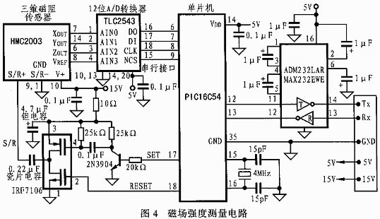圖4是一個(gè)使用HMC2003磁敏傳感器、12位A/D轉(zhuǎn)換器、PIC16C54單片機(jī)、RS232接口和置位/復(fù)位電路構(gòu)成的三維磁場測量電路。