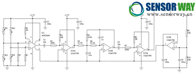 在本電路中,RS1、RS2、RS3和RS4是光刻在MEMS懸臂梁上的四可變電阻;R*是零位調(diào)整電阻;儀表放大 器AD620和C2組成前置級交流放大器,放大原始信號;AD708是高精度雙運放芯片,IC2/A和R2、R3組成 反相比例放大器,目的是調(diào)準(zhǔn)中間級放大倍數(shù);IC/2B和R4、R5、C4、C5組成多路反饋、壓控、二節(jié)低通 有源濾波器,濾除高頻干擾波;IC/3A和R7、R8組成反相比例放大器,調(diào)整整個電路的輸出,也稱滿足刻 輸出。因為該套電路要和計算機接口,需要設(shè)計中心電壓,本設(shè)計的中心電壓為1.65V,IC3/B和R9、R10 組成跟隨電壓穩(wěn)壓電路,使IC3/B運放輸出電路接口電位為1.65V,從而保持整個電路的中心電壓為1.65V。
