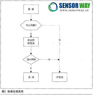 在整個(gè)無線傳感器網(wǎng)絡(luò)中,采取的是普通節(jié)點(diǎn)定時(shí)讀取其傳感器上的光強(qiáng)數(shù)據(jù),并將光強(qiáng)數(shù)據(jù)發(fā)送給中心節(jié)點(diǎn)。中心節(jié)點(diǎn)對接受到的數(shù)據(jù)進(jìn)行處理后傳送給相應(yīng)的節(jié)點(diǎn)用以控制其上的指示燈。在中心節(jié)點(diǎn)上的數(shù)據(jù)處理流程如圖2所示。