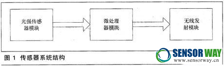 無線傳感器網(wǎng)絡(luò)平臺由光強(qiáng)傳感器模塊、微處理器模塊、無線發(fā)射模塊三個(gè)部分組成,如圖1所示。微處理器模塊和無線發(fā)射模塊集成在一塊板子上,而光強(qiáng)傳感器模塊通過接口與微處理器相連,這樣可以通過更換不同的傳感器模塊來應(yīng)用于各種場合。