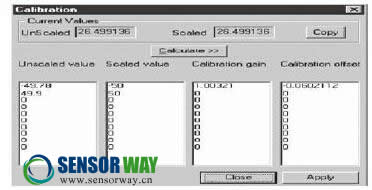 現(xiàn)在,按下“Calculate(計(jì)算)”按鈕,軟件開(kāi)始計(jì)算該傳感器輸入通道標(biāo)定增益和零偏以達(dá)到期望的Scaled值。按下“Apply(應(yīng)用)”按鈕,這些值將被保存到計(jì)算機(jī)軟件系統(tǒng)中。