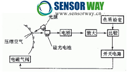 圖4為包裝物料的光電色質(zhì)檢測(cè)原理。若包裝物品規(guī)定底色為白色,因質(zhì)量不佳,有的出現(xiàn)泛黃,在產(chǎn)品包裝前先由光電檢測(cè)色質(zhì),物品泛黃時(shí)就有比較電壓差輸出,接通電磁閥,由壓縮空氣將泛黃物品吹出。