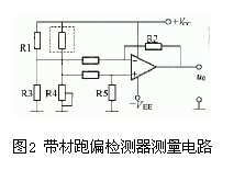 圖2為測(cè)量電路簡(jiǎn)圖。R1、R2是同型號(hào)的光敏電阻。R1作為測(cè)量元件裝在帶材下方,R2用遮光罩罩住,起溫度補(bǔ)償作用。當(dāng)帶材處于正確位置( 中間位)時(shí),由R1、R2、R3、R4組成的電橋平衡,使放大器輸出電壓U0為0。當(dāng)帶材左偏時(shí),遮光面積減少,光敏電阻R1阻值減少,電橋失去平衡。差動(dòng)放大器將這一不平衡電壓加以放大,輸出電壓為負(fù)值,它反映了帶材跑偏的方向及大小。反之,當(dāng)帶材右偏時(shí),U0為正值。輸出信號(hào)U0一方面由顯示器顯示出來(lái),另一方面被送到執(zhí)行機(jī)構(gòu),為糾偏控制系統(tǒng)提供糾偏信號(hào)。