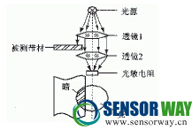 光電式帶材跑偏檢測(cè)器原理如圖1所示。光源發(fā)出的光線經(jīng)過(guò)透鏡1會(huì)聚為行光束,投向透鏡2,隨后被會(huì)聚到光敏電阻上。在平行光束到達(dá)透鏡2的途中,有部分光線受到被測(cè)帶材的遮擋,使傳到光敏電阻的光通量減少。