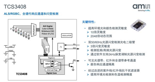為了降低這一干擾,傳感器解決方案供應(yīng)商ams為我們帶來了全新的TCS3408顏色傳感器。它的靈敏度更高,可用于測(cè)量環(huán)境光的色溫和光強(qiáng),還可以檢測(cè)光學(xué)的物理閃爍,能讓手機(jī)攝像頭消除人造光源導(dǎo)致的照片缺陷。