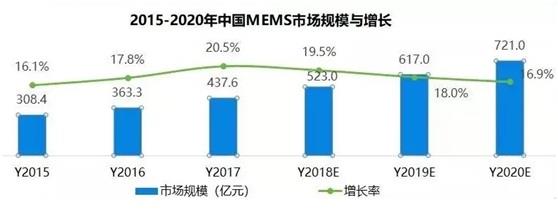 Yole Developement 數(shù)據(jù)顯示,全球MEMS傳感器產(chǎn)品需求近年增勢迅猛,2017年MEMS傳感器市場規(guī)模為437.6億元,平均以超過15%的增長率增長,2020年預(yù)計(jì)將達(dá)到721億元。