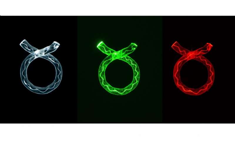 藝術(shù)家凱倫·坎寧安(Karen Cunningham)的三只玻璃戒指。彩色的光線揭示了藝術(shù)品中使用的鉆石的內(nèi)部線條。圖片來(lái)源:Michael Haines Photography