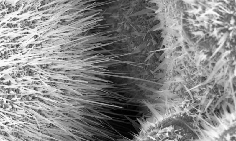 顯微鏡下的傳感器表面:研究小組從金屬微粒中生長出細小的金屬絲和尖峰,這些金屬微粒特別擅長捕獲氣體分子。圖片來源:功能納米材料工作組