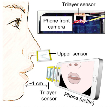 便攜式三層光纖傳感器可以連接到智能手機的前置攝像頭,將單層光纖傳感器放置在鼻子上方。圖片(修改后)由Science Advances提供