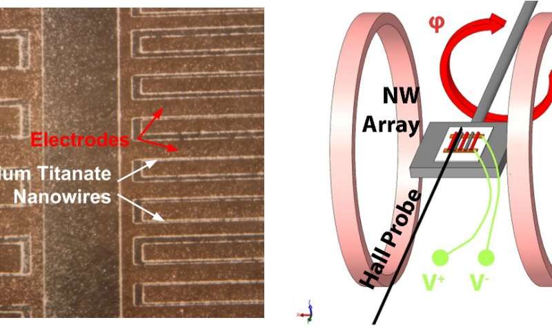 每條納米線由兩半組成-鈦酸鋇具有壓電特性,并與磁致伸縮材料鈷鐵氧體配對。在磁場的存在下,例如在汽車發(fā)動機的鋼齒輪中存在的磁場,鈷鐵氧體會發(fā)生形狀變化,從而使壓電鈦酸鋇產(chǎn)生應(yīng)變,從而引起電極化。通過將納米線陣列連接到數(shù)據(jù)收集源,磁電產(chǎn)生的電脈沖可用于感測發(fā)動機正時或通過輪速檢測打滑。功能性磁場傳感器是通過并聯(lián)連接許多納米線形成的。