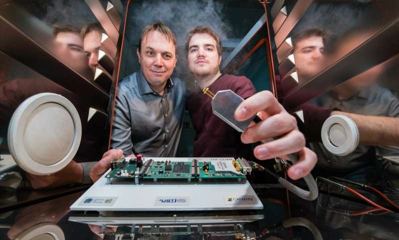 一個(gè)即使在高溫工業(yè)烤箱中也能精確測量空氣濕度的傳感器系統(tǒng):由AndreasSchütze教授領(lǐng)導(dǎo)的研究團(tuán)隊(duì)的項(xiàng)目經(jīng)理Tilman Sauerwald(左)和博士生Henrik Lensch。(照片來源:Oliver Dietze