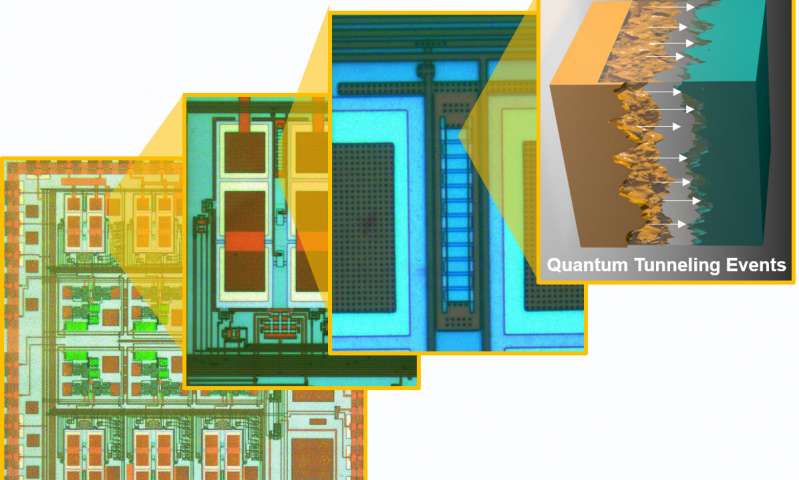 量子隧穿傳感器芯片組和匹配的Fowler-Nordheim隧穿勢壘的顯微照片。圖片提供:圣路易斯華盛頓大學(xué)麥凱維工程學(xué)院Chakrabartty實(shí)驗(yàn)室