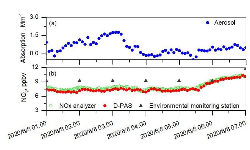 在實(shí)驗(yàn)過程中,開發(fā)的D-PAS傳感器與商用NOX分析儀在大氣中測量NO 2時(shí)的比對(duì)和一致性證明了這種新型D-PAS傳感器的可靠性。
