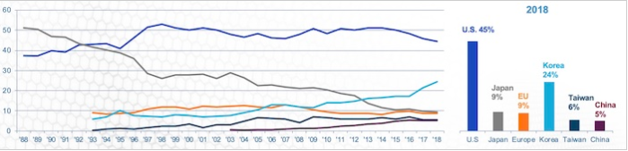 該線圖描述了1988-2018年半導(dǎo)體市場份額的趨勢。條形圖顯示了截至2018年的市場份額。圖片由SIA提供