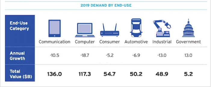 關(guān)于半導(dǎo)體最終用途的2019年需求的高級圖形。圖片由新航提供