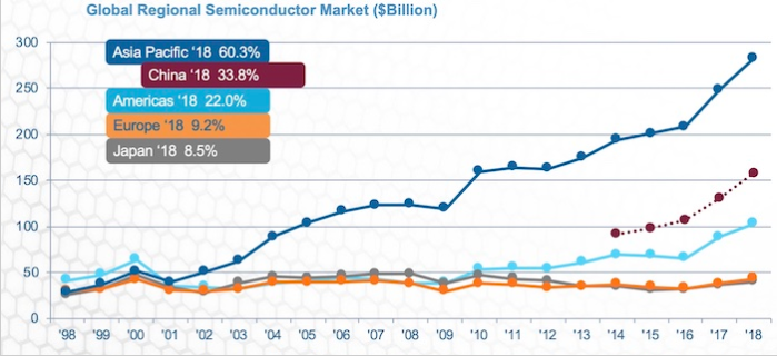 折線圖顯示了全球區(qū)域半導(dǎo)體市場的趨勢。在這里,您可以看到美國的領(lǐng)先地位是在2000年。圖片由SIA提供
