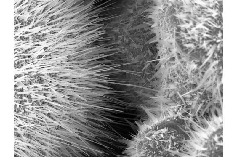 顯微鏡下的傳感器表面:研究小組從金屬微粒中生長(zhǎng)出細(xì)小的線和尖峰,這些金屬微粒特別擅長(zhǎng)捕獲氣體分子。
