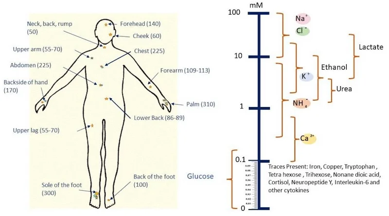 汗腺和化學(xué)痕跡的位置。圖片由Sensors(巴塞爾)提供