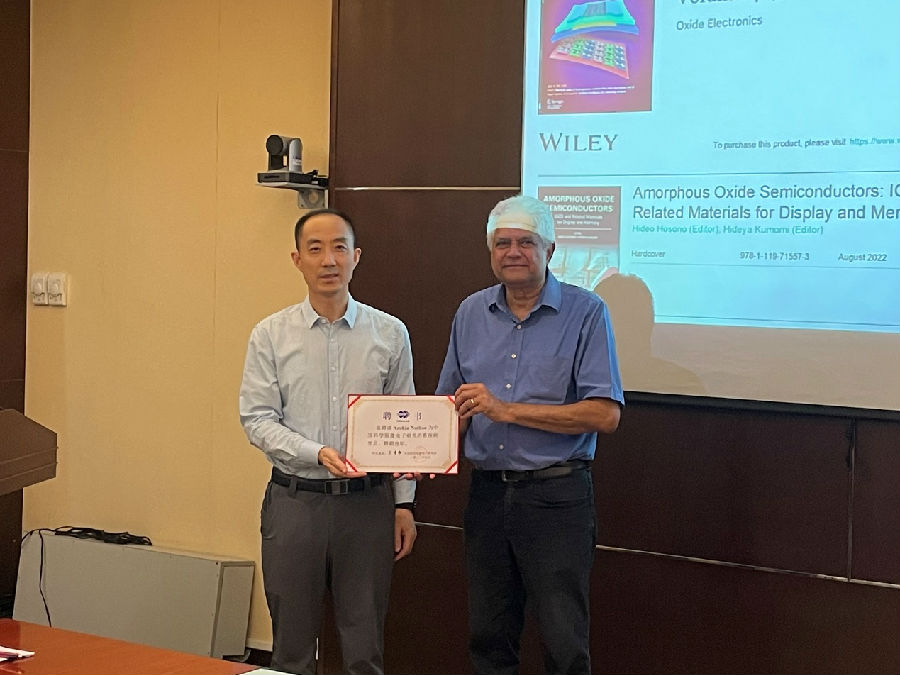 會(huì)上,人事處處長(zhǎng)王雷向Arokia Nathan教授頒發(fā)了“中國(guó)科學(xué)院微電子研究所客座研究員”證書。