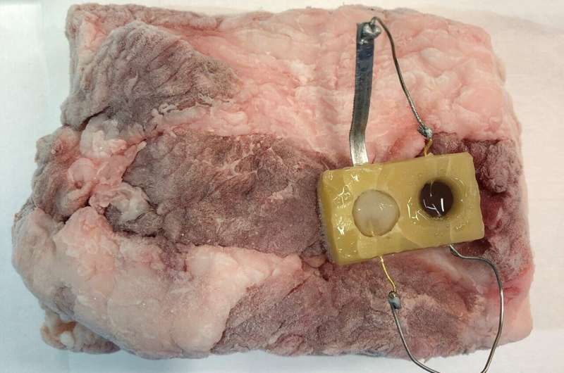 由可食用材料設(shè)計(jì)的概念驗(yàn)證傳感器會(huì)產(chǎn)生可見的顏色變化(如右圓圈所示),就像一塊冷凍豬肉解凍一樣。來源:改編自ACS Sensors 2022,DOI:10.1021/acssensors.2c01280