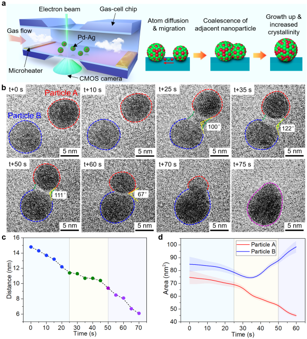 圖3.原位TEM實(shí)驗(yàn)實(shí)時(shí)記錄合金催化劑的融合過程