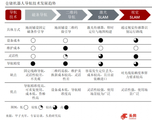 磁條導(dǎo)航與二維碼導(dǎo)航,具有維護(hù)成本高,路線固定導(dǎo)致靈活性相對較差的特點(diǎn)。視覺SLAM相對激光SLAM的技術(shù)成熟度較低,且對光線的依賴度較高,并且算法量大也是行業(yè)難點(diǎn)。