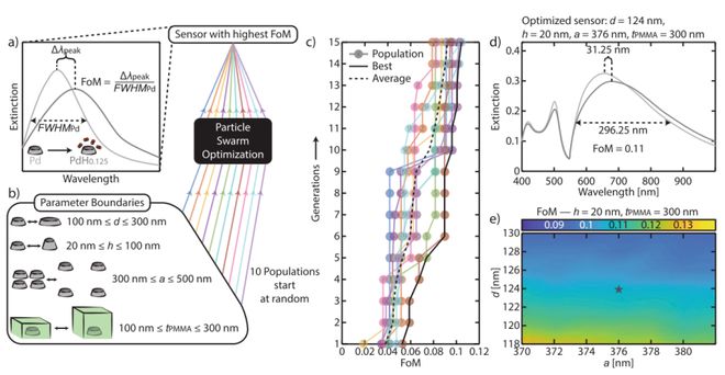 針對(duì)這一問題,柏萍使用逆向納米光子的設(shè)計(jì)方法,并結(jié)合人工智能設(shè)計(jì)出一種超靈敏等離子體氫氣傳感器。同時(shí),該傳感器也基于鈀納米顆粒周期性陣列中的集體共振。