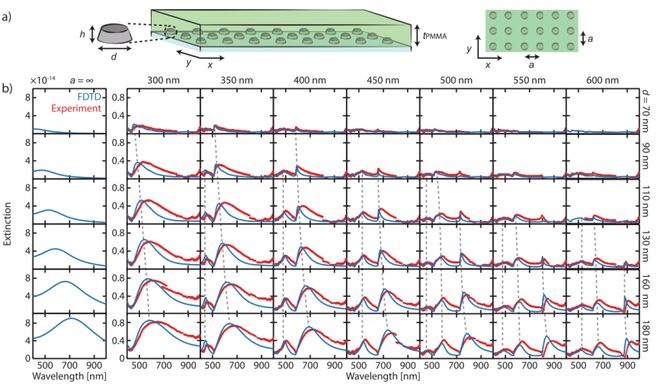 結(jié)合顆粒陣列中集體表面晶格共振的窄消光光譜特性,她和合作者以較大化傳感器的靈敏度為目的,優(yōu)化了鈀納米顆粒陣列的各項(xiàng)幾何參數(shù),比如顆粒直徑、高度、周期性陣列的晶格常數(shù)、以及覆蓋其上的過濾層厚度。