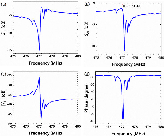 圖1. GaN SAW諧振器 (a) S11、(b) S21曲線及導納的 (c) 幅度、(d) 相位曲線。