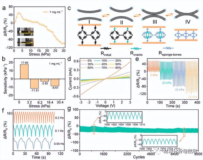 (e) RGO@PU海綿在頻率為0.1Hz的各種循環(huán)壓力值下的相對電阻變化。