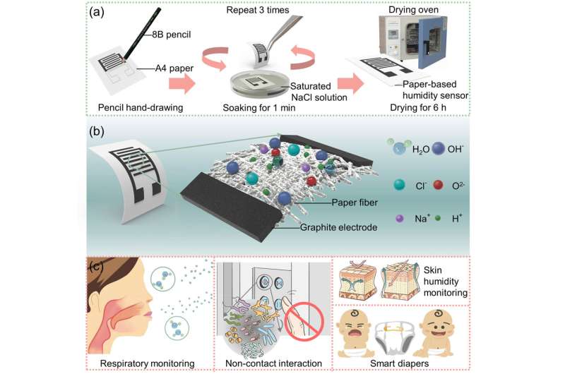 圖示顯示紙上鉛筆水合傳感器的制造和應(yīng)用。示意圖顯示了(a)制造過程和(b)柔性鉛筆紙水合傳感器的響應(yīng)機(jī)制,以及(c)在健康監(jiān)測,非接觸式開關(guān)和皮膚表征中的應(yīng)用。學(xué)分:Huanyu “Larry” Cheng / Penn State