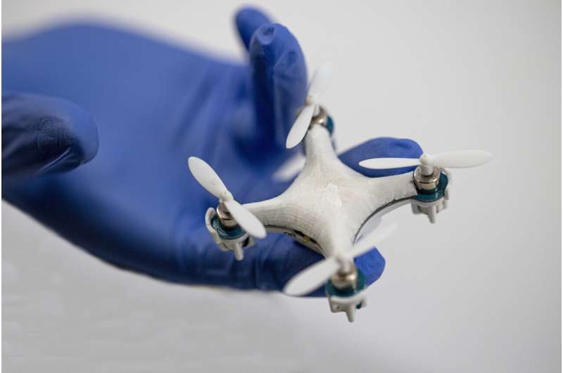 傳感器可以呈現(xiàn)出看似無窮無盡的各種形式。為了證明這一點(diǎn),研究小組創(chuàng)造了病毒傳感無人機(jī),其中的機(jī)身嵌入了傳感器材料。在飛行過程中,螺旋槳引導(dǎo)氣流通過無人機(jī)的多孔主體,著陸后可以對其進(jìn)行檢查。在示例中,無人機(jī)對空氣傳播的病原體(SARS-CoV-2)做出反應(yīng),可以從遠(yuǎn)程距離監(jiān)測環(huán)境。