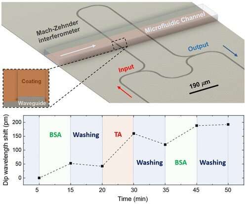 在實驗中,研究人員將蛋白質(zhì)和單寧酸薄膜逐層沉積到PIC的敏感表面上。通過微流體通道泵送牛血清白蛋白后,他們用去離子水沖洗掉多余的白蛋白,泵入單寧酸,重新涂覆蛋白質(zhì)涂層,并使用干涉儀的光學讀數(shù)實時分析每層的沉積過程。
